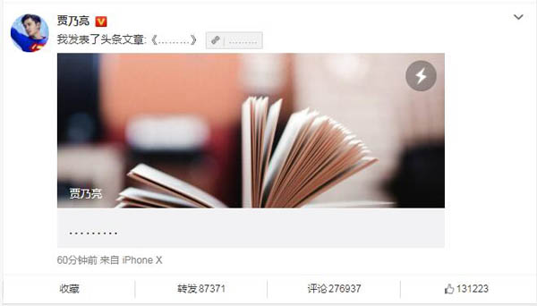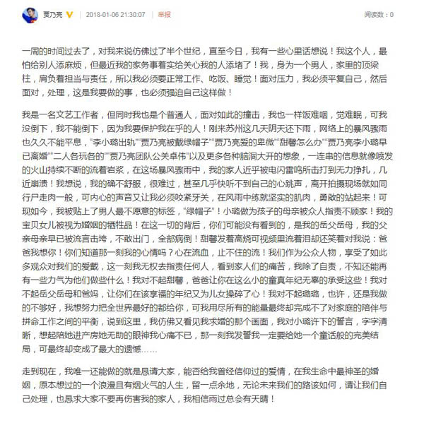 近日,李小璐PGONE绯闻闹得沸沸扬扬的同时,贾乃亮也终于再次发声,在微博中发长文谈最近感受及表示希望大家能给自己和家人一些空间,自己的事情自己处理。